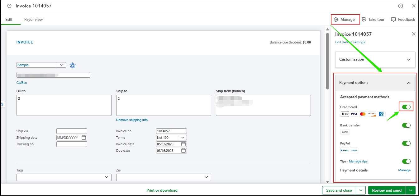 Once activated and linked to your QuickBooks account, we can enable the Payment options section on your invoices. This lets you choose which online payment methods to offer your customers.