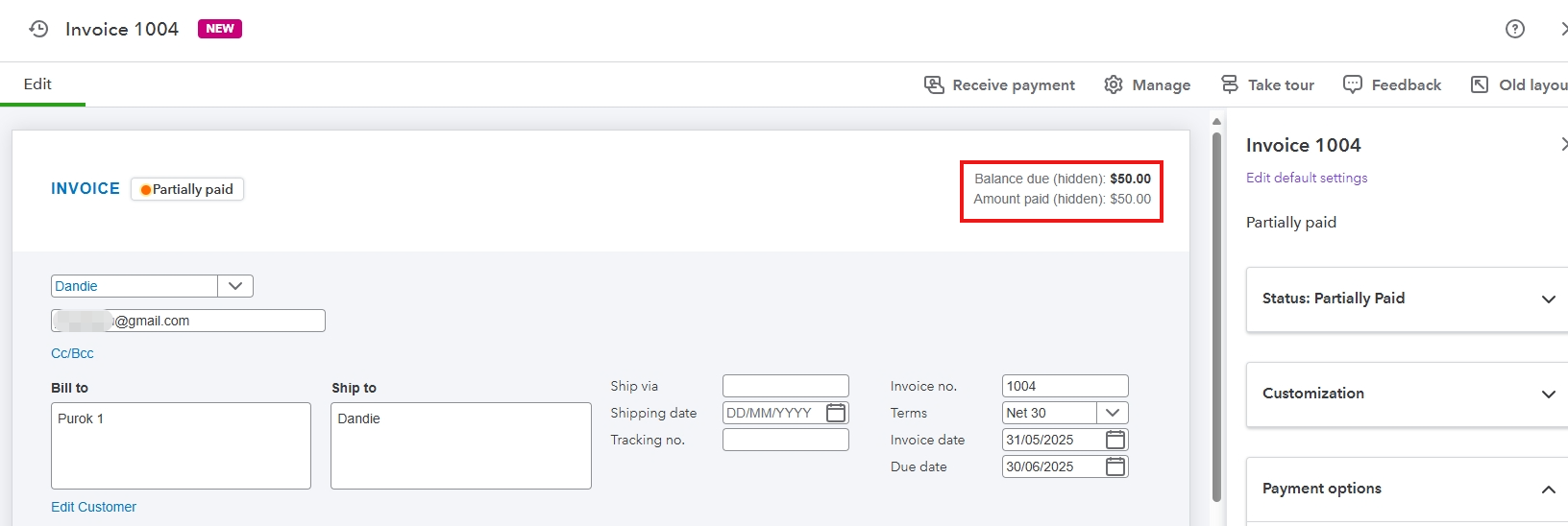 - View the Balance due and the Amount paid at the top right portion of the screen.