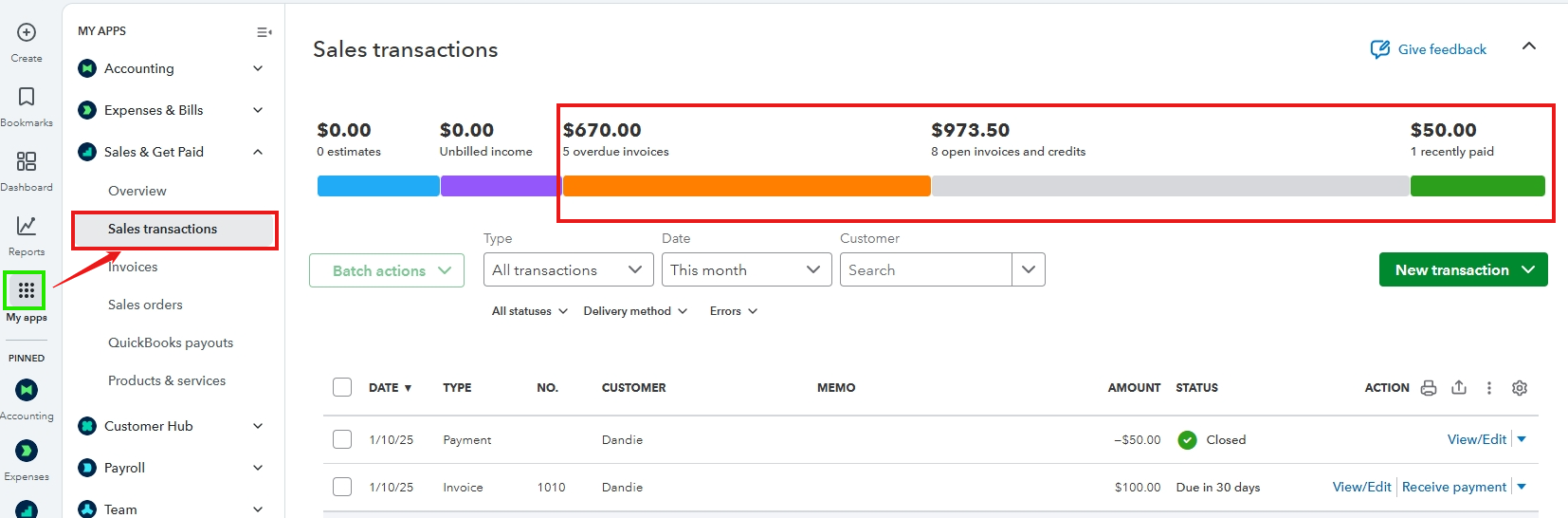 - Select Sales & Get Paid, and then Sales transactions.