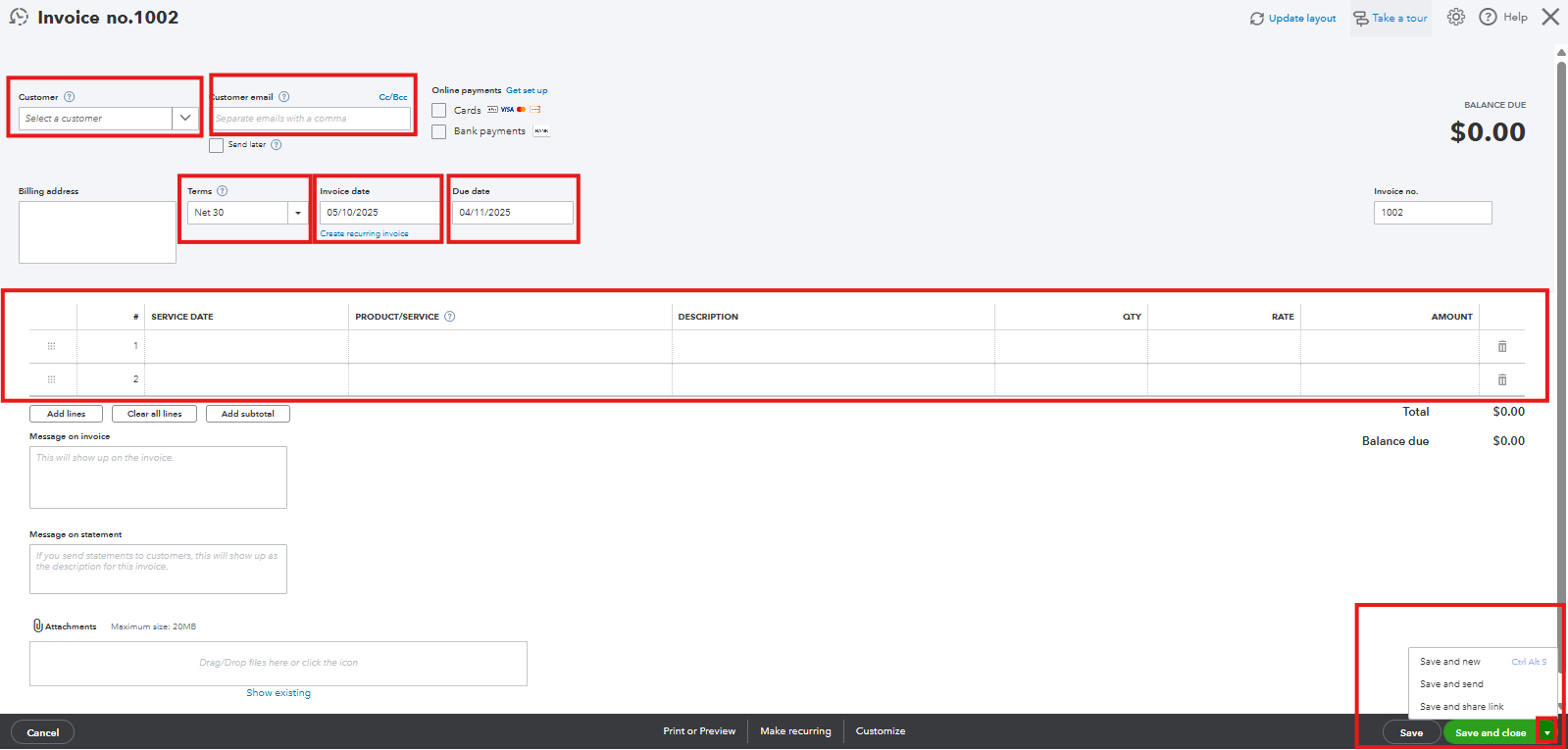 - Complete the required fields, including Customer, Invoice date, Due date, and Terms.