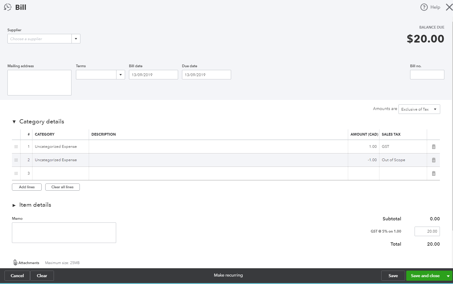 4. Create a line item with any positive dollar amount (you can follow the screenshot below by using $1.00, to keep it simple). Ensure you've selected your GST tax code for this item. The category you select is up to you.