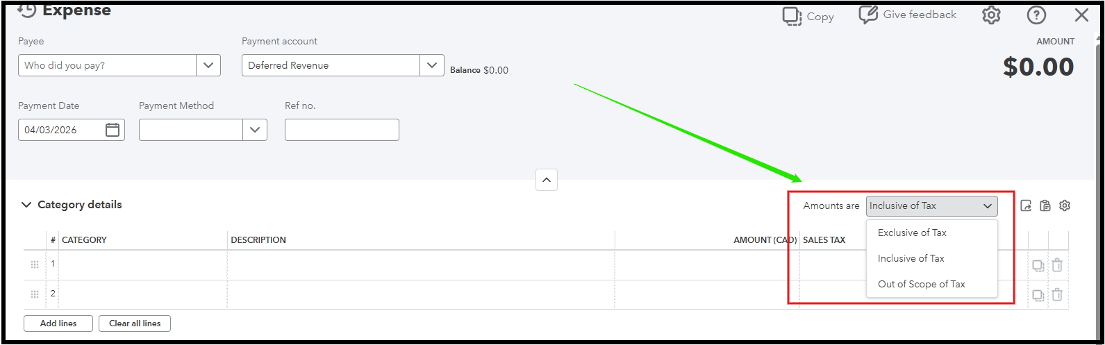 Before creating an expense, ensure that it is not marked as Out of Scope of Tax, as this will automatically hide the tax column. If the tax column is still missing after verifying the scope, I recommend refreshing your account by logging in using a private or incognito browser.