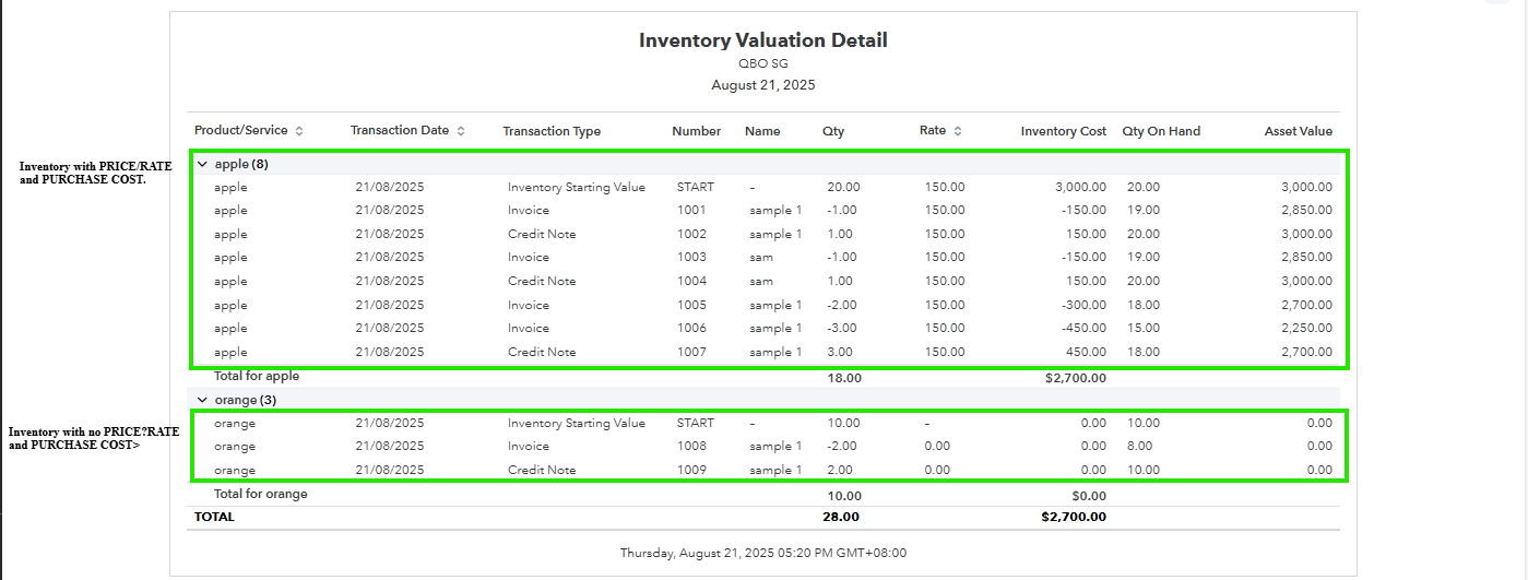 After adding the price rate and purchase costs, the rates will appear when generating the inventory report. See the screenshot below for your visual reference.