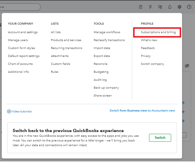 To update your card information in QuickBooks Online, you'll need to select the Subscription and Billing under Profile tab. Here's how: