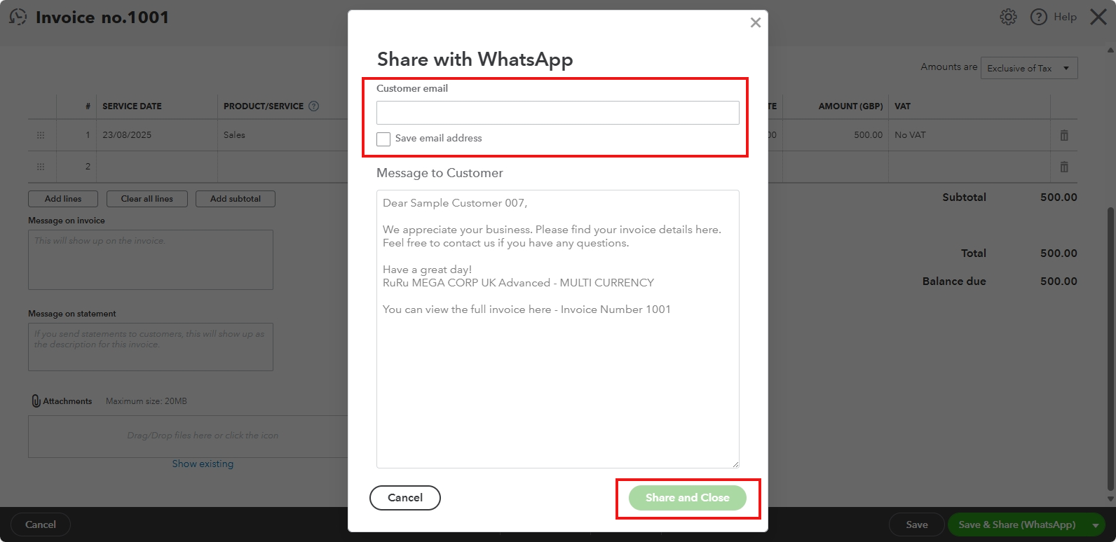 - Click Share and Close. A new tab for WhatsApp Web will open, where you can select a contact and send the invoice link.