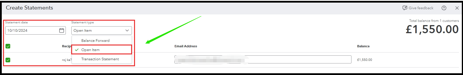 To view all outstanding invoices, including those older than one month, you’ll want to select the Open Item statement type. The invoices will appear once you send the statement or when clicking Print or Preview.