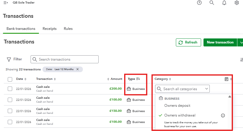Hi there, Meghob. On QuickBooks Sole Trader, you can categorize Owner Withdrawals by using the Business transaction type.