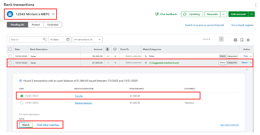 Since you’ve mentioned that your new account is registered and funds are showing there from the old banking account, let’s match a transfer from the downloaded bank transactions.