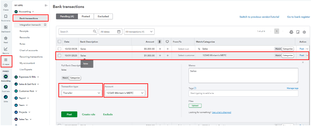 Once done, let’s proceed with categorizing these transactions correctly to reflect a transfer between accounts.