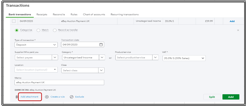 Currently, QuickBooks Online (QBO) doesn't allow you to match a receipt with multiple splits in one go, as you can only select a single split. As a workaround, you can attach the receipt to each individual downloaded payment transaction to keep track of all related receipts. Here's how you can add attachments to bank transactions in the For Review tab on the Banking page:
