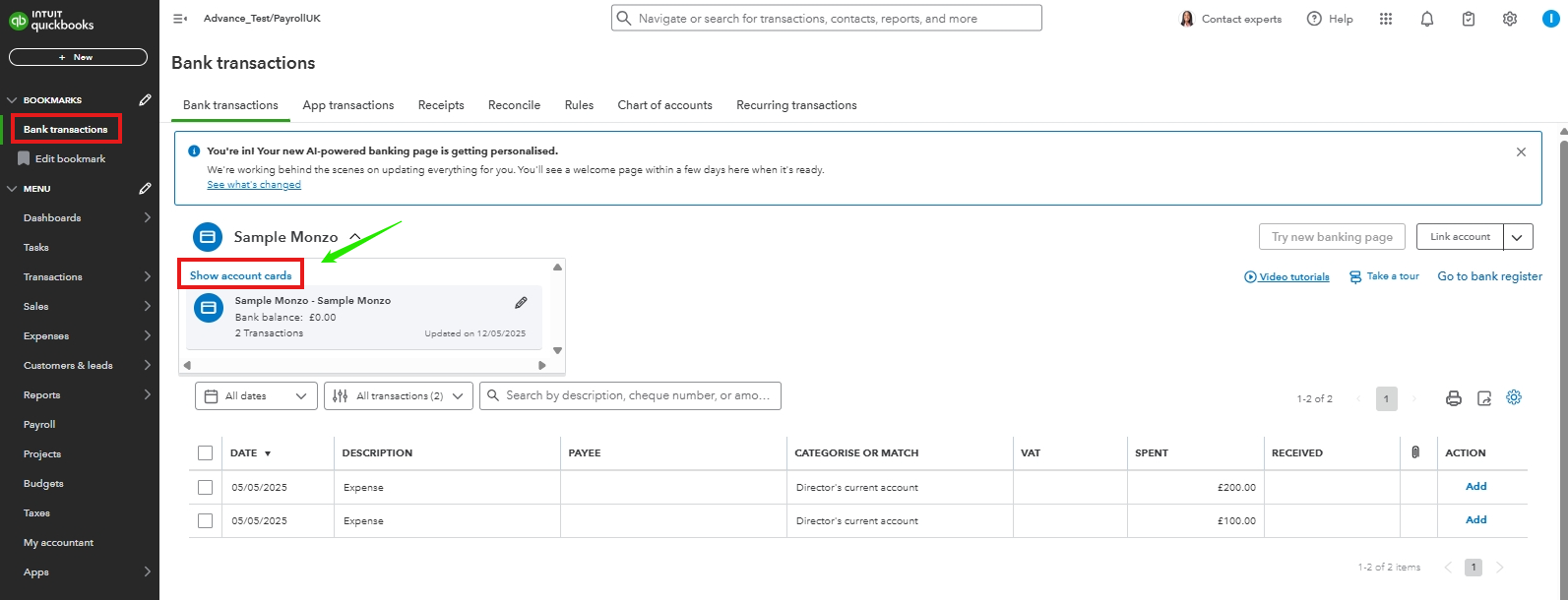 QuickBooks Online (QBO) offers an option to hide account cards within the Bank Transactions tab. Let's ensure that your bank accounts are not hidden by default, Stephen.