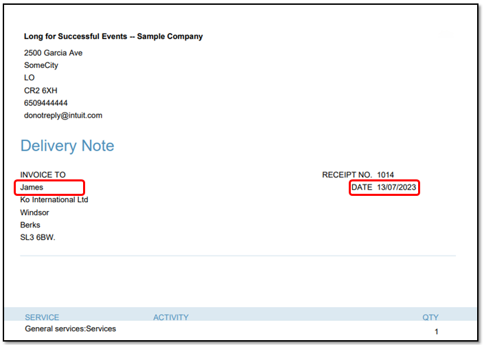 Once you print a delivery note from an invoice or sales receipt, the name and date are already included there except for the signature. See the image below for visual reference.