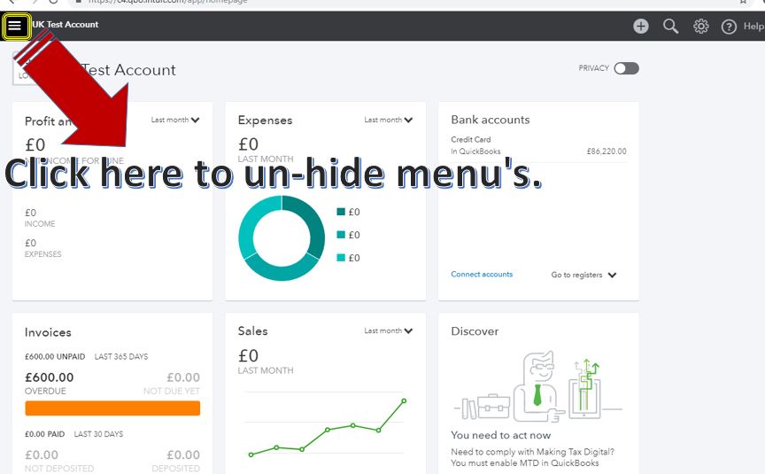 In your QuickBooks, click the three horizontal lines beside your account name. This process will let you hide and un-hide your left menu's.