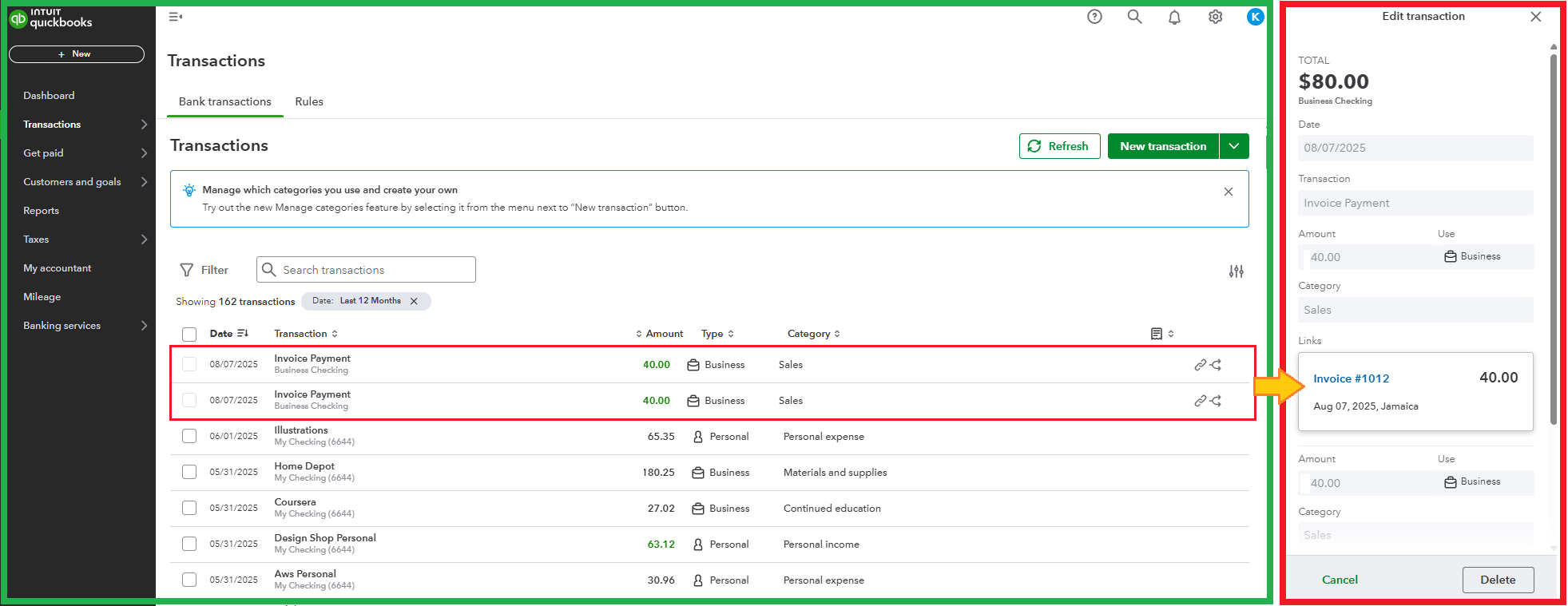 Once you delete the Invoice, the payment on your Bank transactions should display the whole amount (£80). If not, please reload the page to reflect the changes.