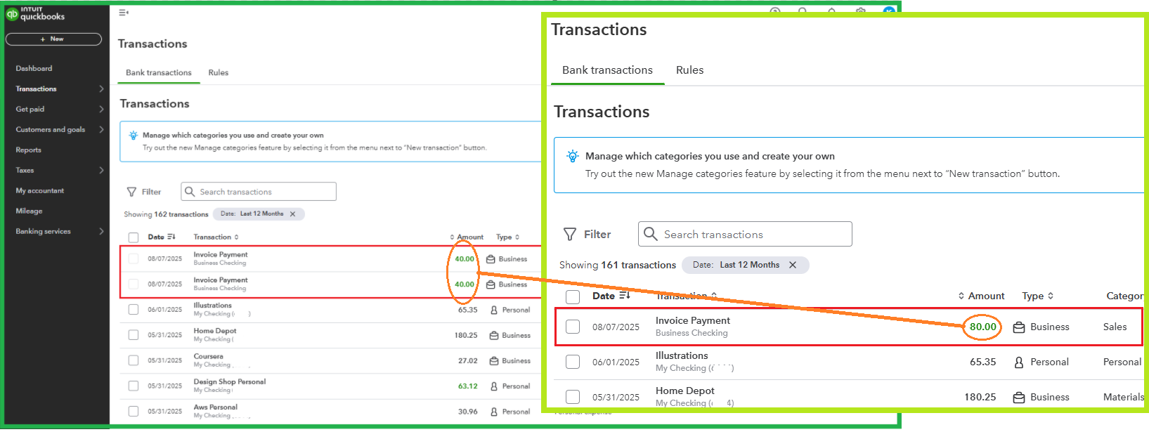 The payment (£80) shows twice on the Bank transactions when applying to the Invoice (£40) because of the balance left (£40). That's why both transactions will show as linked to the same invoice.