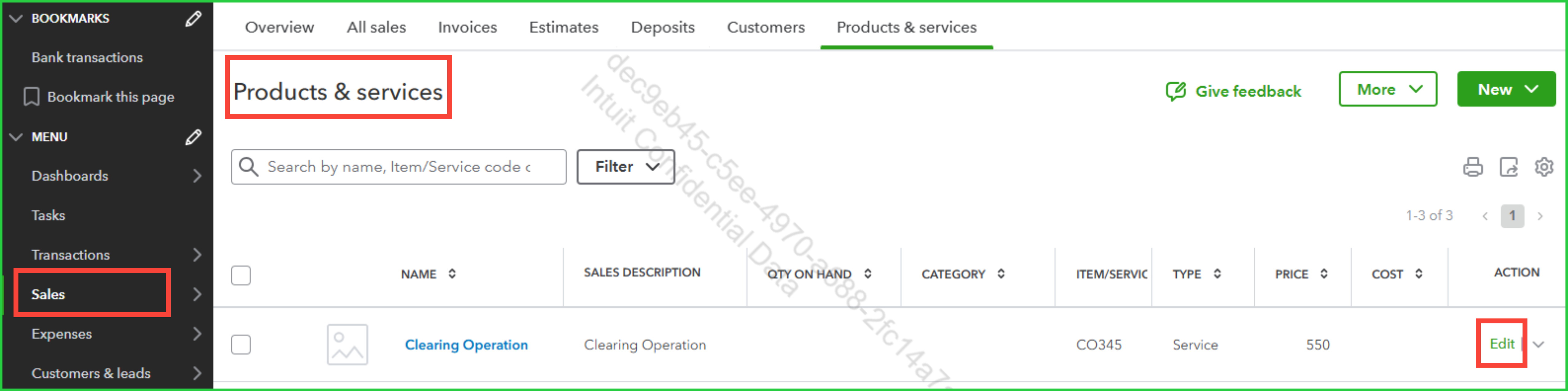 - Click on the Edit option for the product or service you want to set the tax amount with.