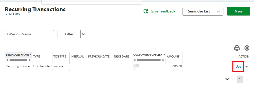 - Click the dropdown arrow, then select Use under the Action for the recurring invoice template.