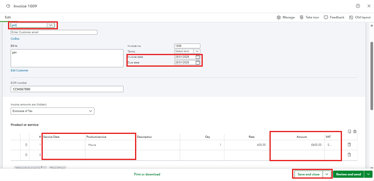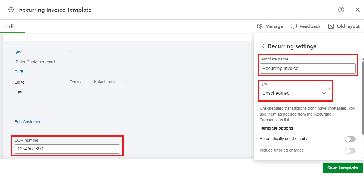When creating a new regular invoice, you'll need to enter the EORI number into the custom field every single time. However, you can use a recurring transaction for an invoice if you don't want to enter the EORI number every time you create an invoice. You'll only need to change the other details, such as Customer, Products or services, Invoice date, Due date, and VAT.