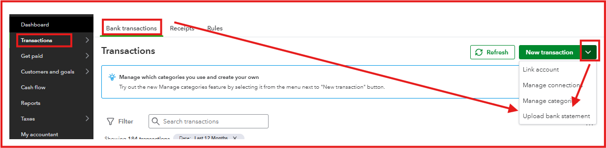 - Go to the Transactions tab, then choose Bank transactions.