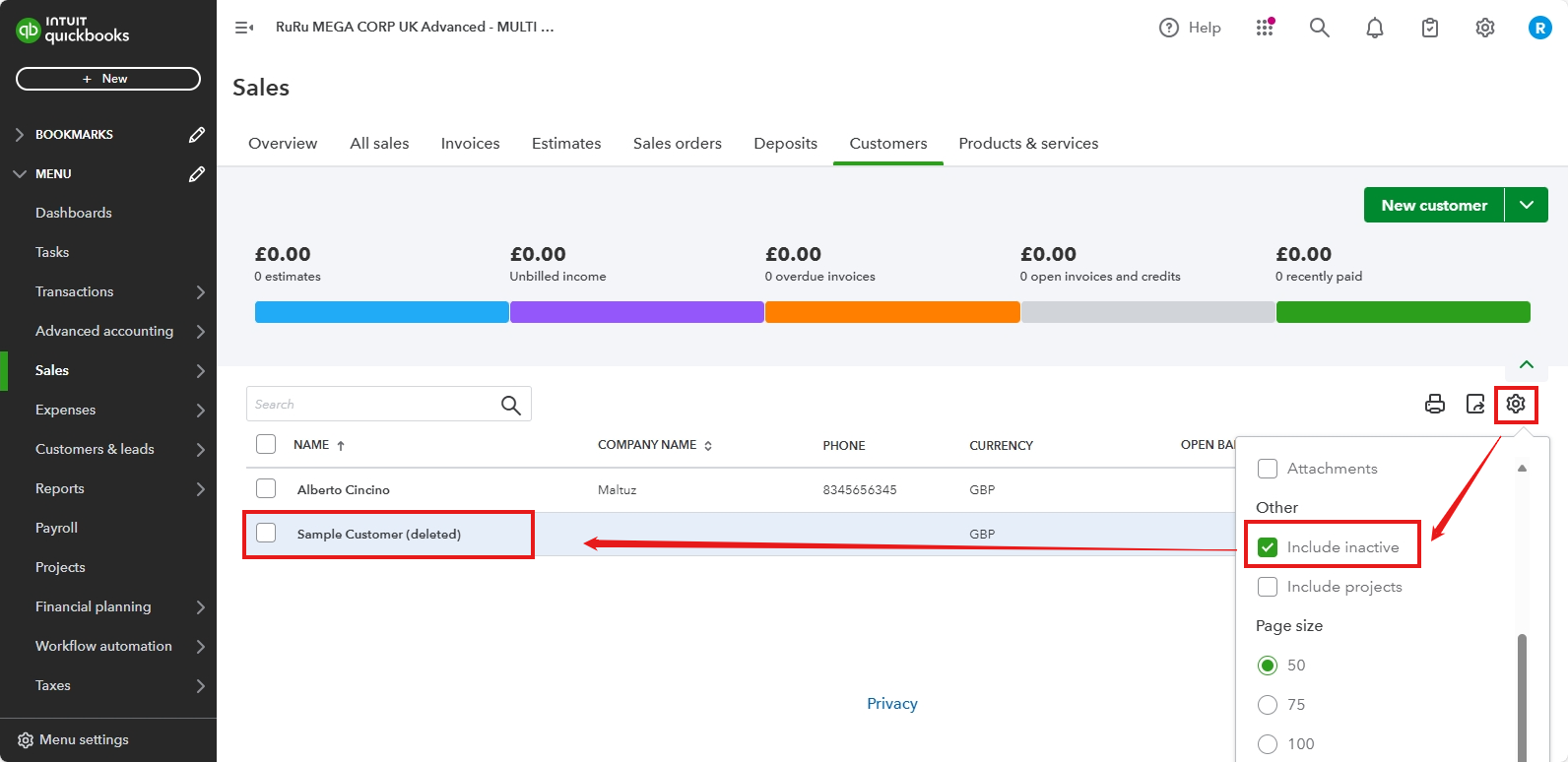 - Check the box for Include inactive to display all customers.
