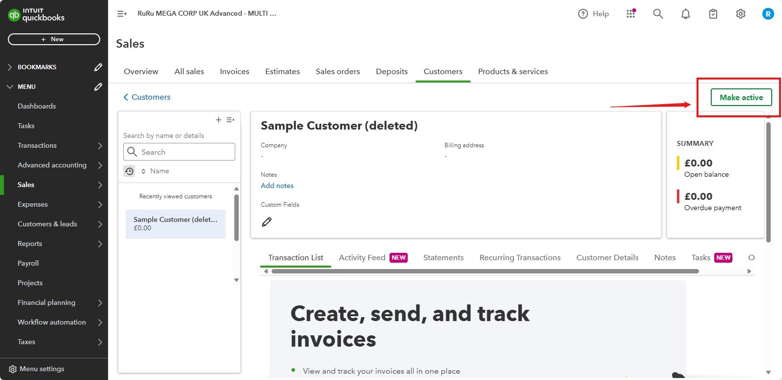 - Click Make active to reactivate the account.