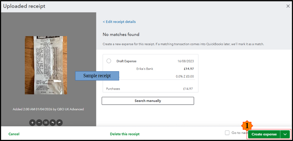 - Choose the same customer used in the receipt. Then, a side panel will appear with the suggested expense transaction.