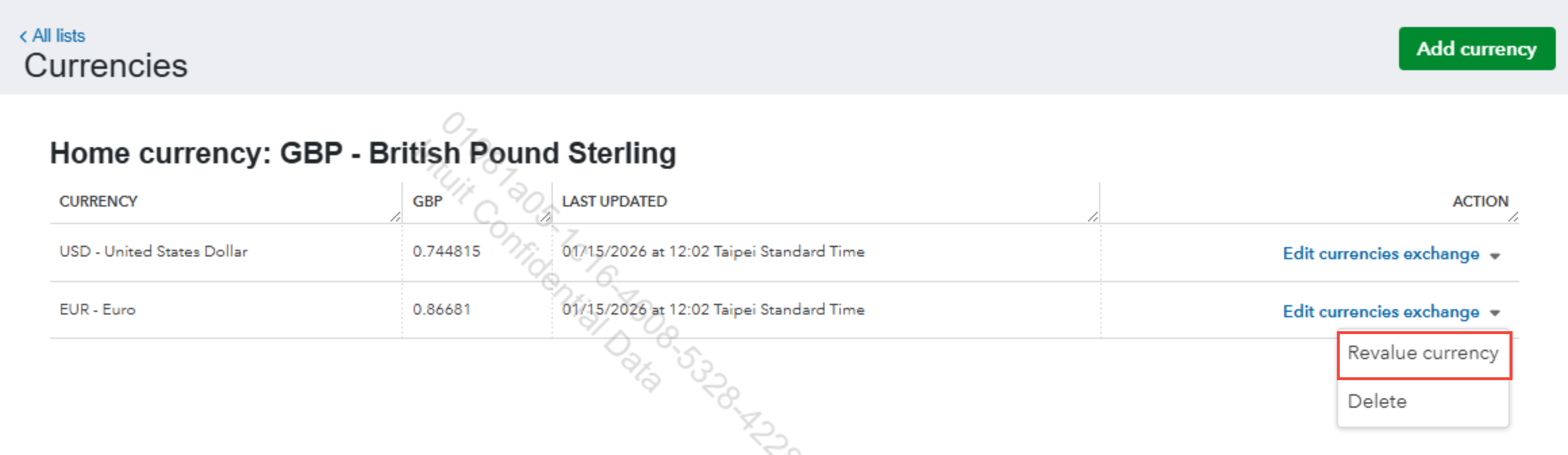 - In the Actions column, click the dropdown arrow (▼) and select Revalue currency.