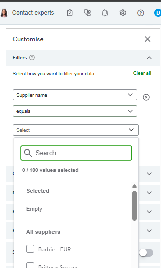 - Choose Supplier Name in the first box.
