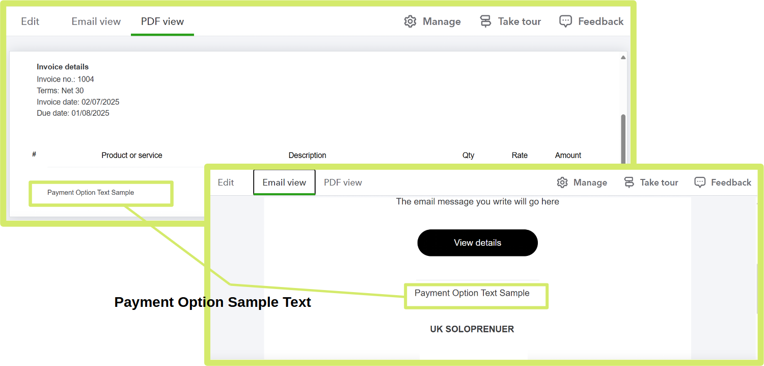 At the same time, you also don’t need to add anything under the Note to Customer section since the text from Payment Options is already applied to your invoices.