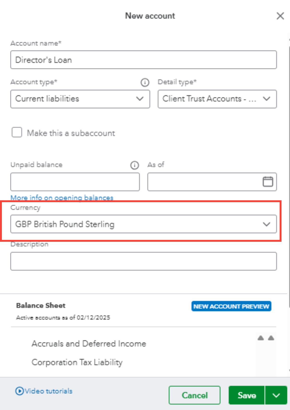 - Enter the name for the account, for example, “Director’s Loan".
