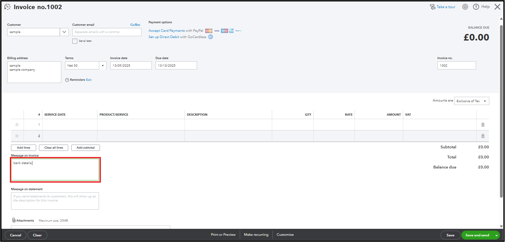 Also note that if you have added your bank details in the Email messages, they will only appear once you send your invoices.