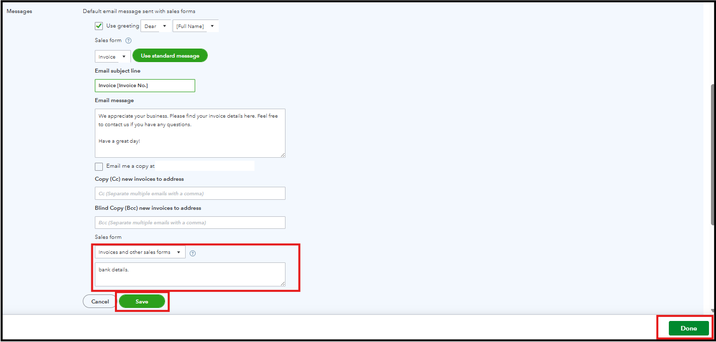 To better assist you, could you please specify where to enter your bank details in the Sales settings? Is it in the Email message or in the Sales form?