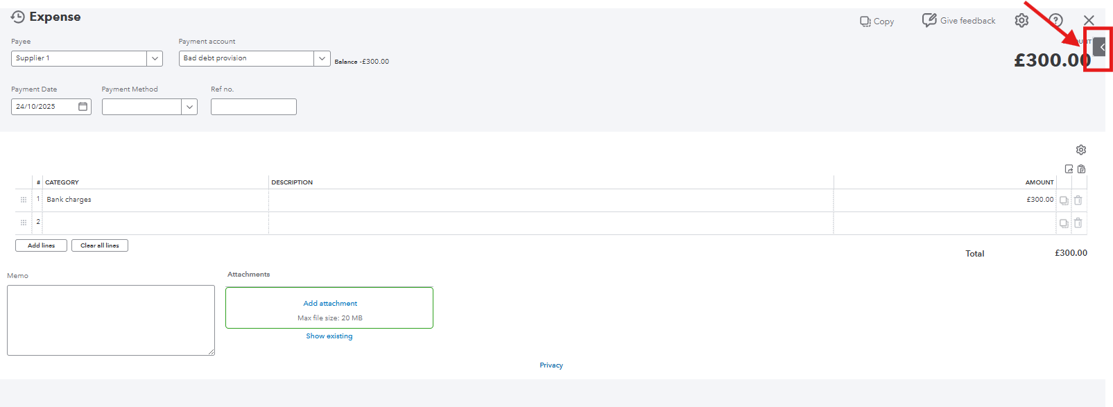 Next, you need to link the original direct debit transaction you've recorded as an Expense to the new Bill. Here's how: