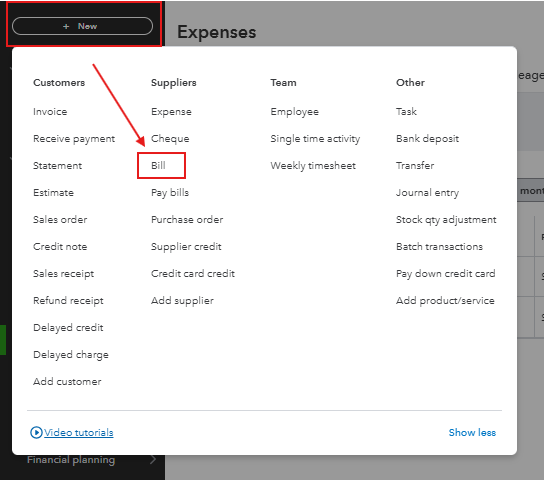 - Click on + New. Then, select Bill under the Suppliers column.