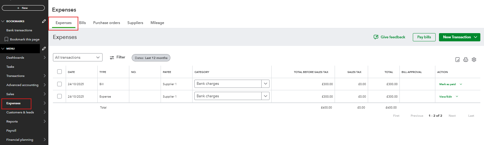 - Go to Expenses from the left navigation bar, then click the Expenses tab.