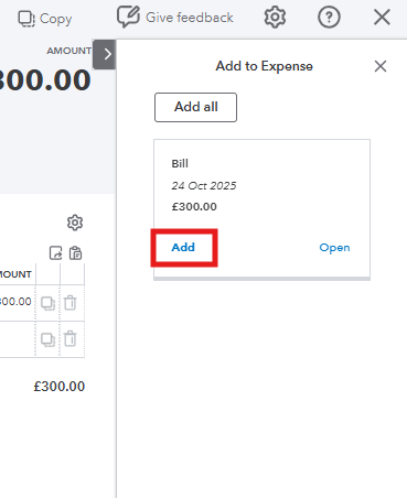 - On the Expense screen, look at the top right corner for a small arrow and click it. A pop-up will appear saying Add to Expense, showing the bill you just recorded. Click Add to link it.