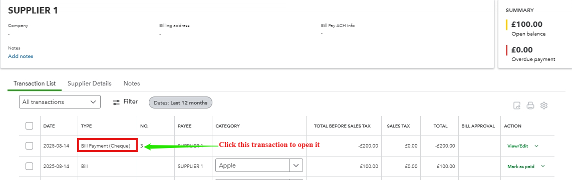 - Under the Transaction List section, find and open the Bill Payment transaction.