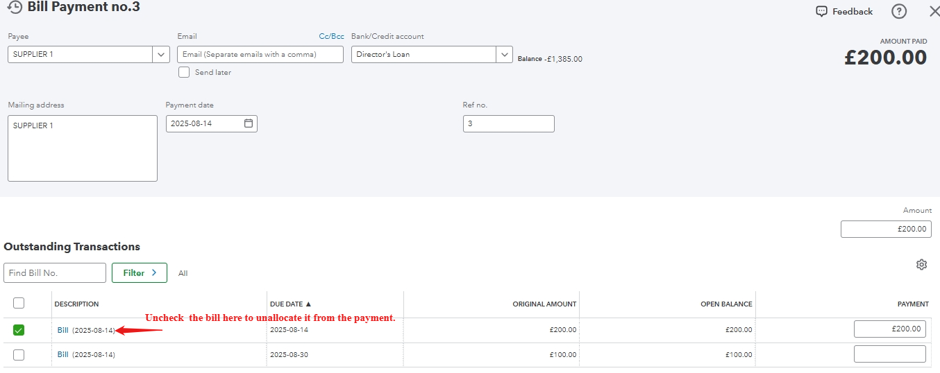 - Uncheck the bill under Outstanding Transactions.