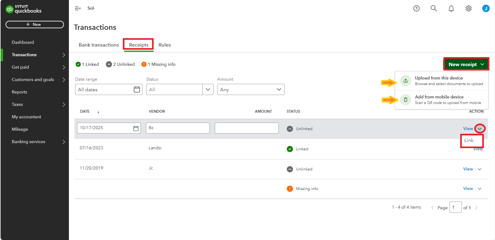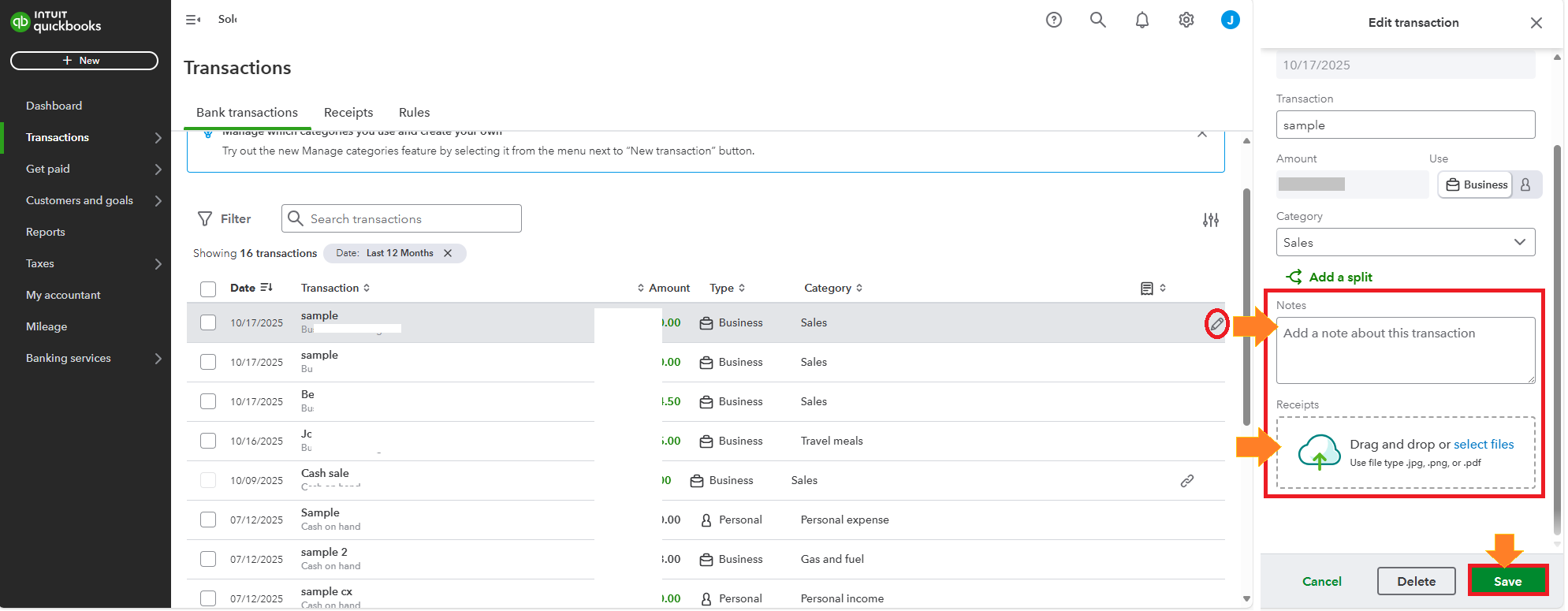 In the meantime, manually add the Notes and Receipts by clicking the pencil icon on the synced entries in the Bank transactions page. Alternatively, you can go to the Receipts tab to upload one via browser or use a mobile device, then Link from there. I'm adding screenshots for your reference below: