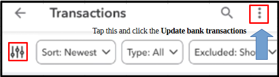 If everything looks good with your bank and if you’re using the mobile app, make sure your date range under Sort & filter is set to the most recent dates so it includes the transactions you’re expecting. Once done, go to the Transactions tab and tap Update bank transactions to refresh your bank feed manually.
