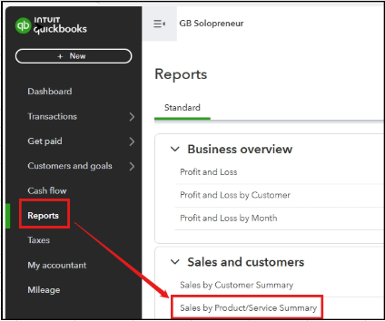 Next, you can run the Sales by Product/Service Summary report by heading to the Reports tab and selecting it. This can help you see the total sales for each product or service which includes the quantity, amount, % of sales, and average price.