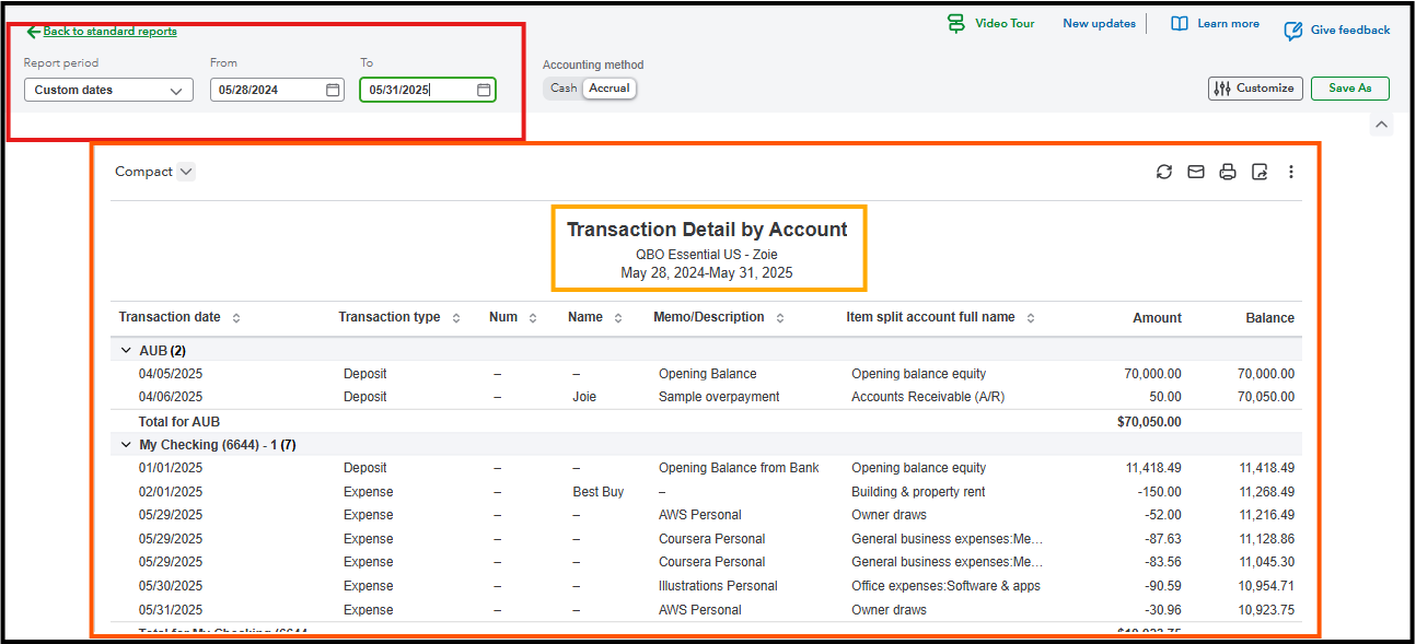 If you need to view the expenses from May 28, 2024, to May 31, 2025, you can use the Profit and Loss report or the Transaction Detail by Account report. These reports allow you to customize the date range and display detailed expense transactions for your selected time frame.