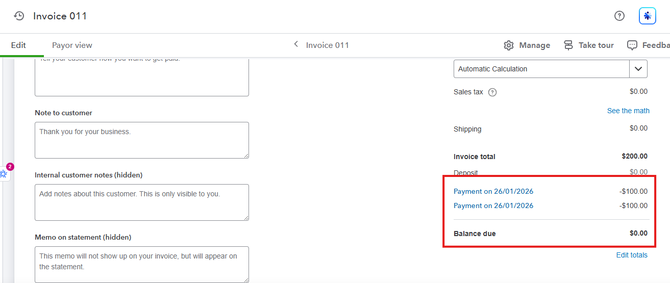 - You should see two payment lines with amounts and dates, and the remaining balance should be zero (or the correct outstanding amount).