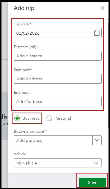 - Enter the trip details, ensuring you mark it as Business to automatically calculate the deduction.