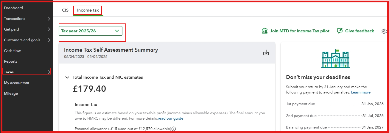 Once saved, you can view the trip in the Income Tax Self-Assessment by going to the Taxes tab and selecting the relevant tax year. For further guidance, refer to the sample screenshot provided.
