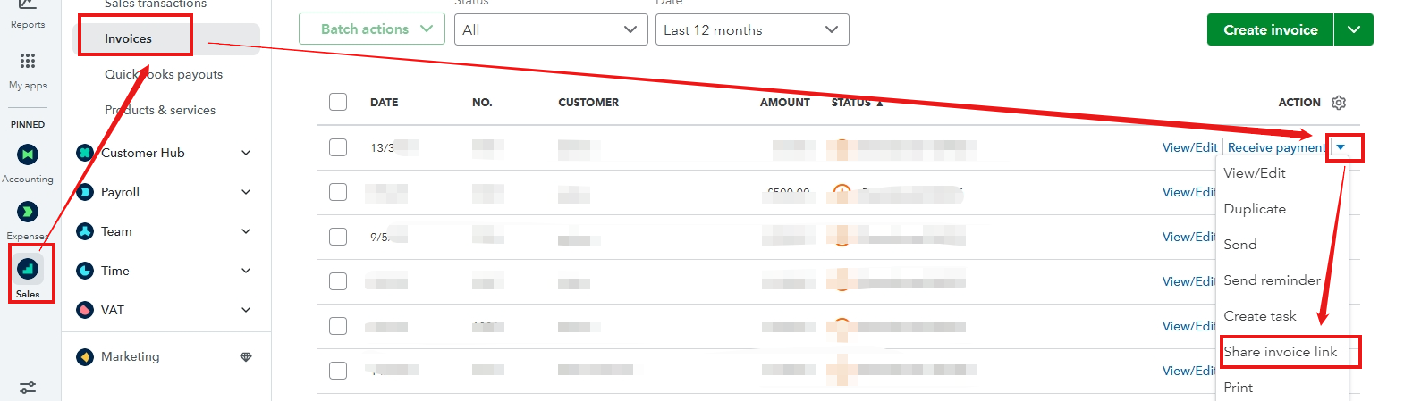 - In the Action column, click the dropdown arrow next to Receive payment.