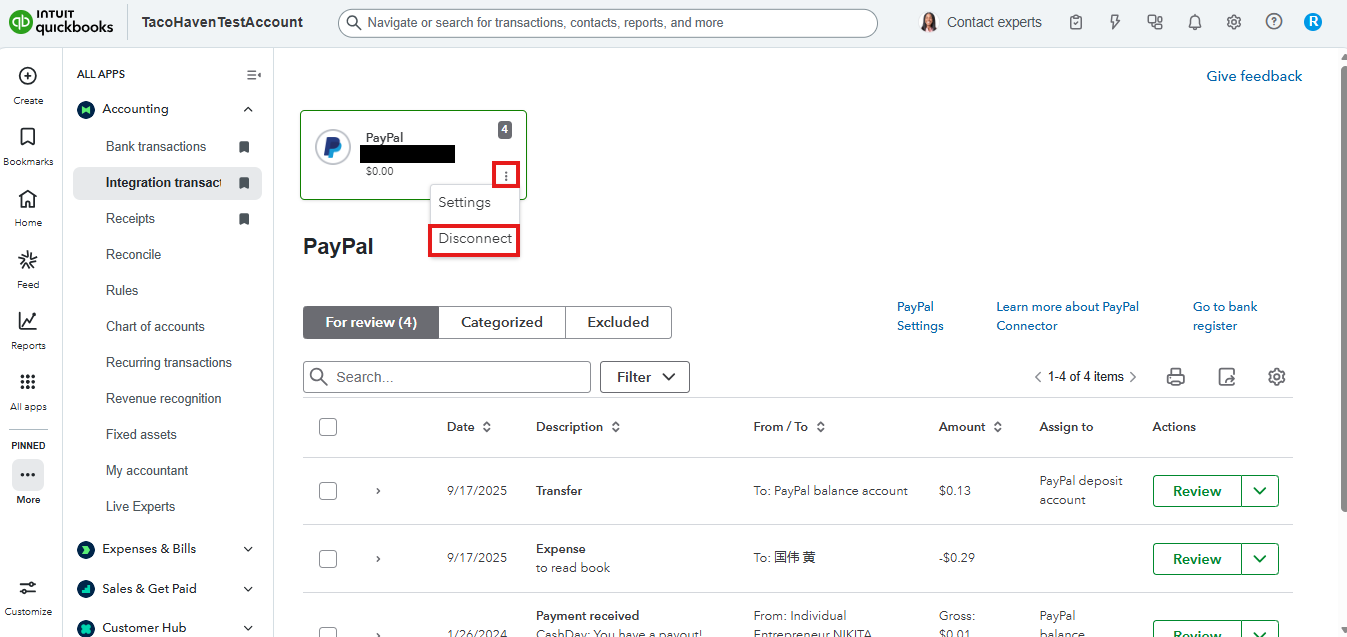To disconnect the integration between Etsy and QuickBooks, you won’t see a pencil icon directly. Instead, you can do this by clicking on the three dots (ellipses) next to the Etsy integration. Once click, a Disconnect option will appear, allowing you to sever the connection.