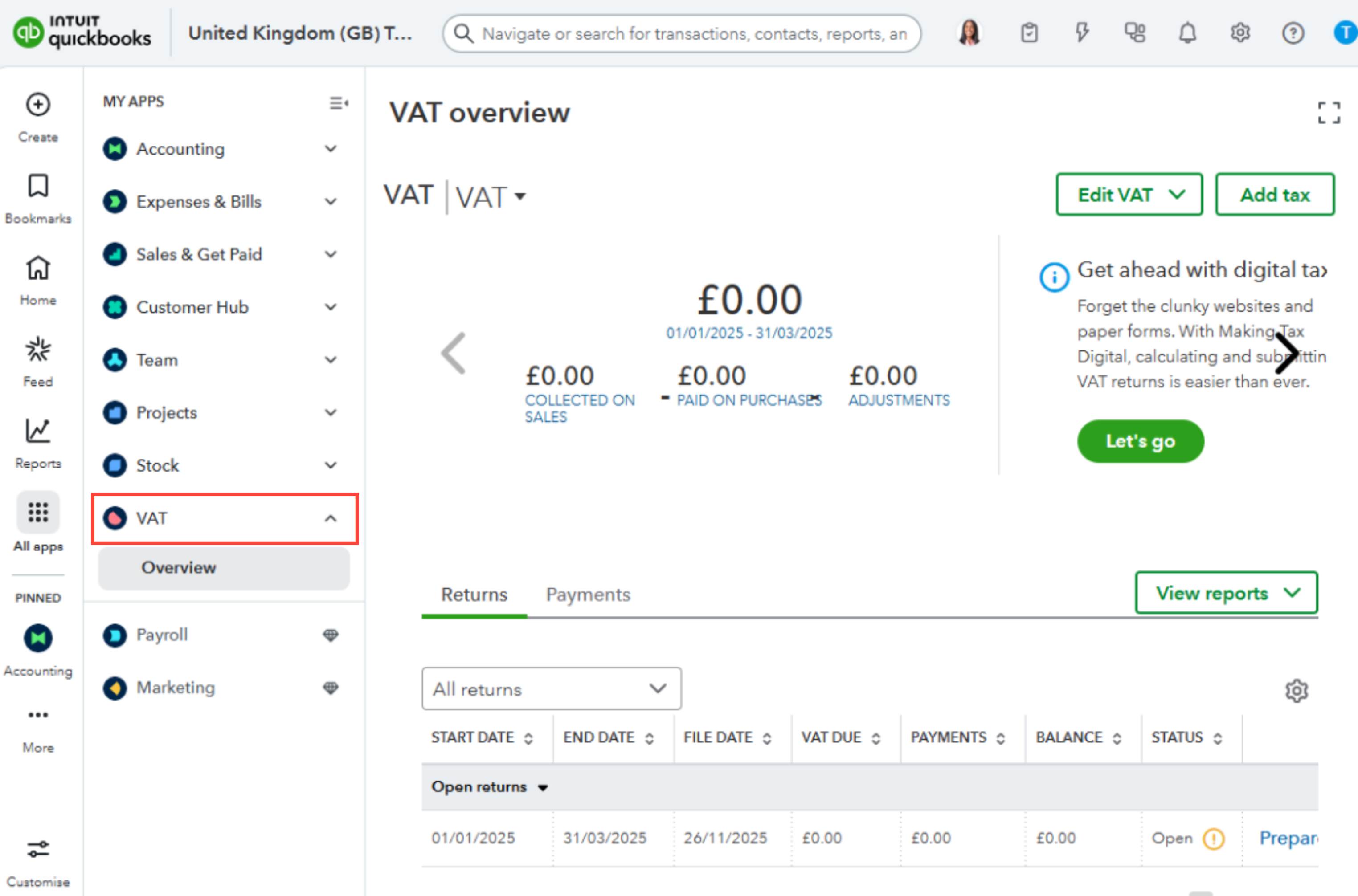 In the updated QuickBooks Online layout, VAT is no longer displayed under the Taxes tab. Instead, it is now accessible directly on the newly designated tab within the platform.