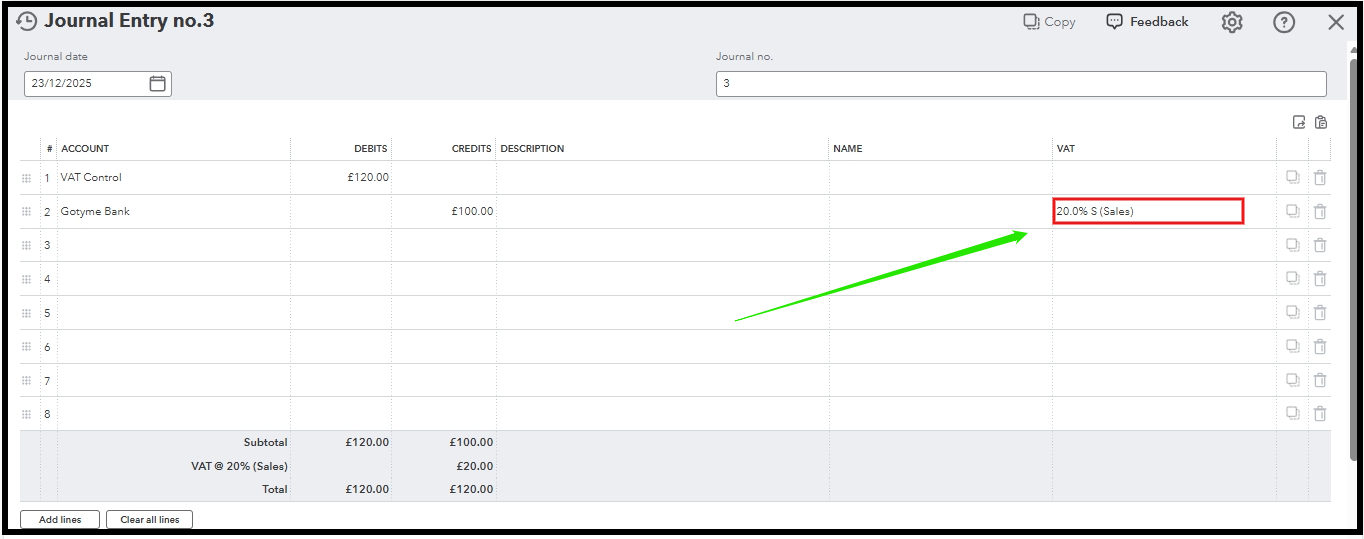 When I enter the VAT against VAT Control it doesnt show up on the report in Box 1. This always used to work in the desktop version but the same journal entry is not being picked up in the online version. Any suggestions?
