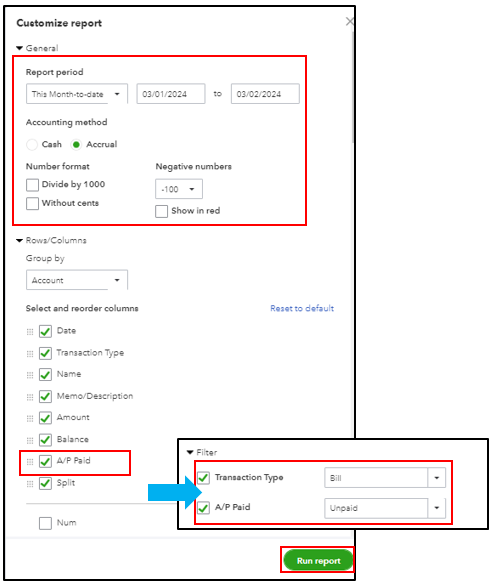 - From the Change Columns section, check the Name, Transaction Type, Due Date, Amount, A/P Paid, and other fields you want to show in the report.